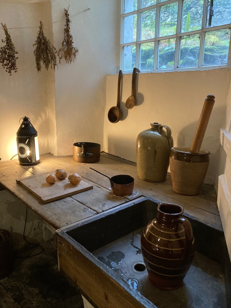 As I am always drawn to things domestic, especially textiles and sewing in general, the cottage intrigued me. Quite dark and I imagine chilly in times where the only source of heat was an open hearth in the main living areas and probably damp too, the cottage sitting on the side of a beautiful hill!